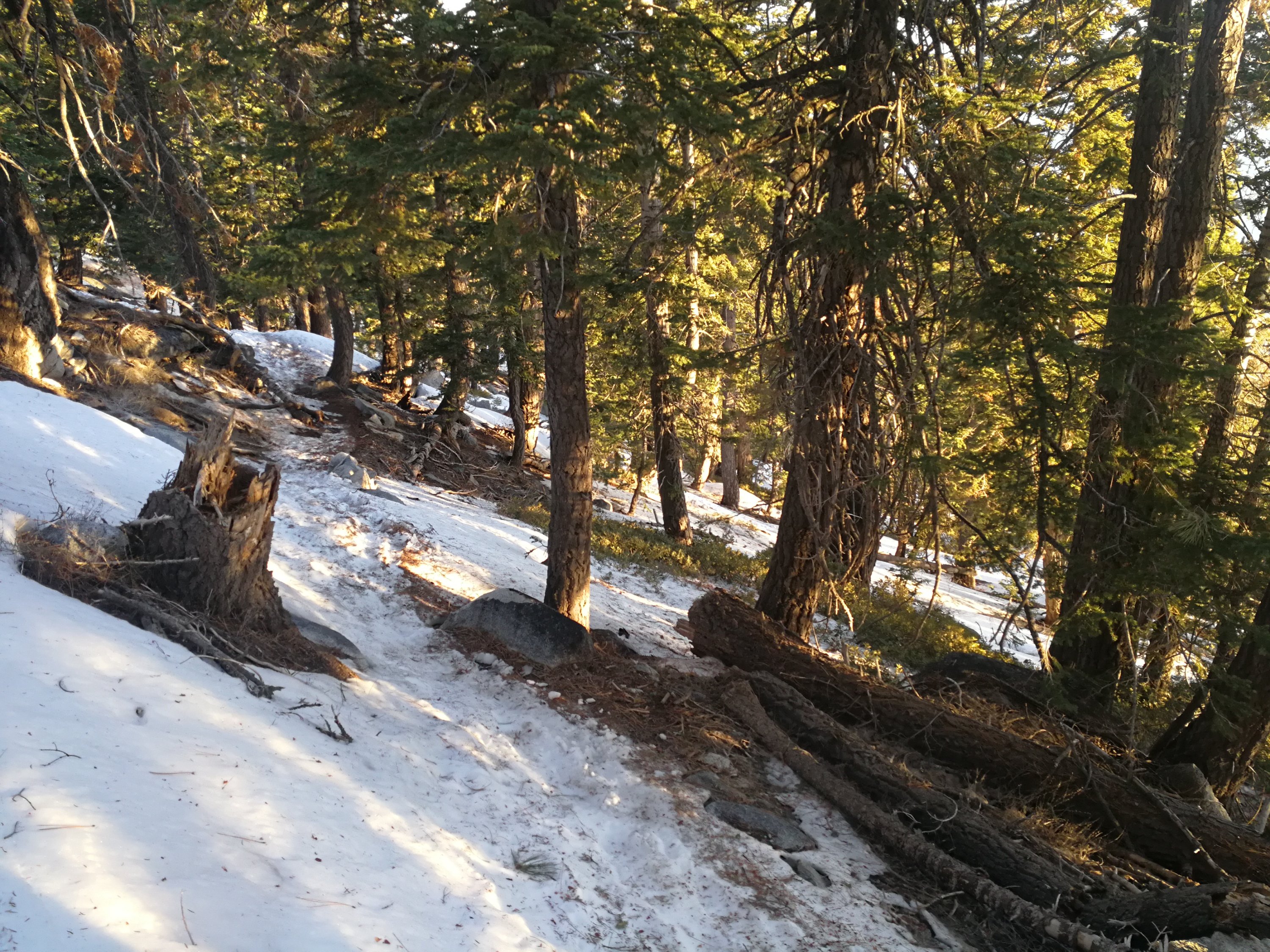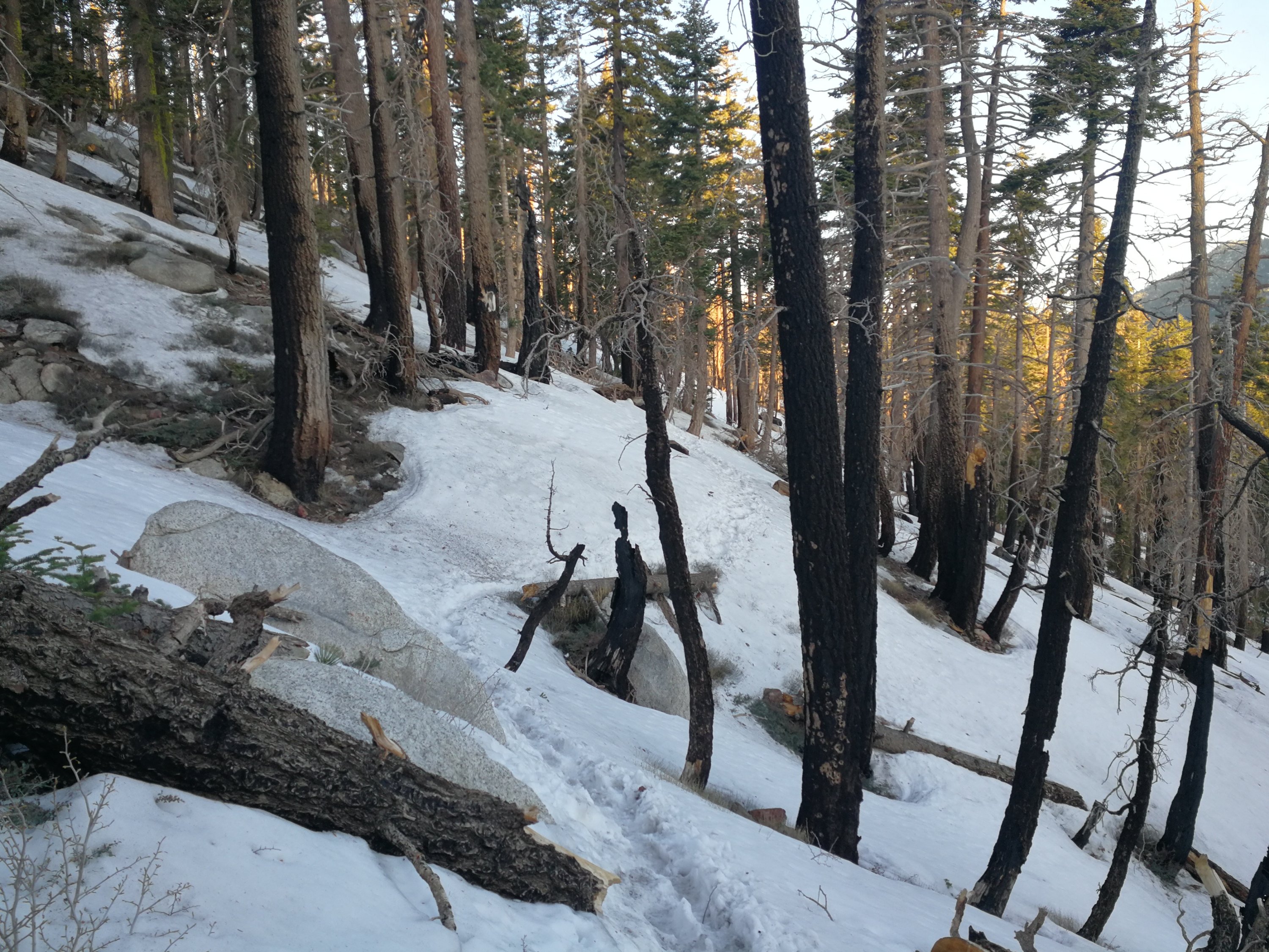 Path was indistinct, missing or sketchy in many places due to the snow, but managed to get to camp after taking my capacity of water at the latest stream – nothing for 18 miles.