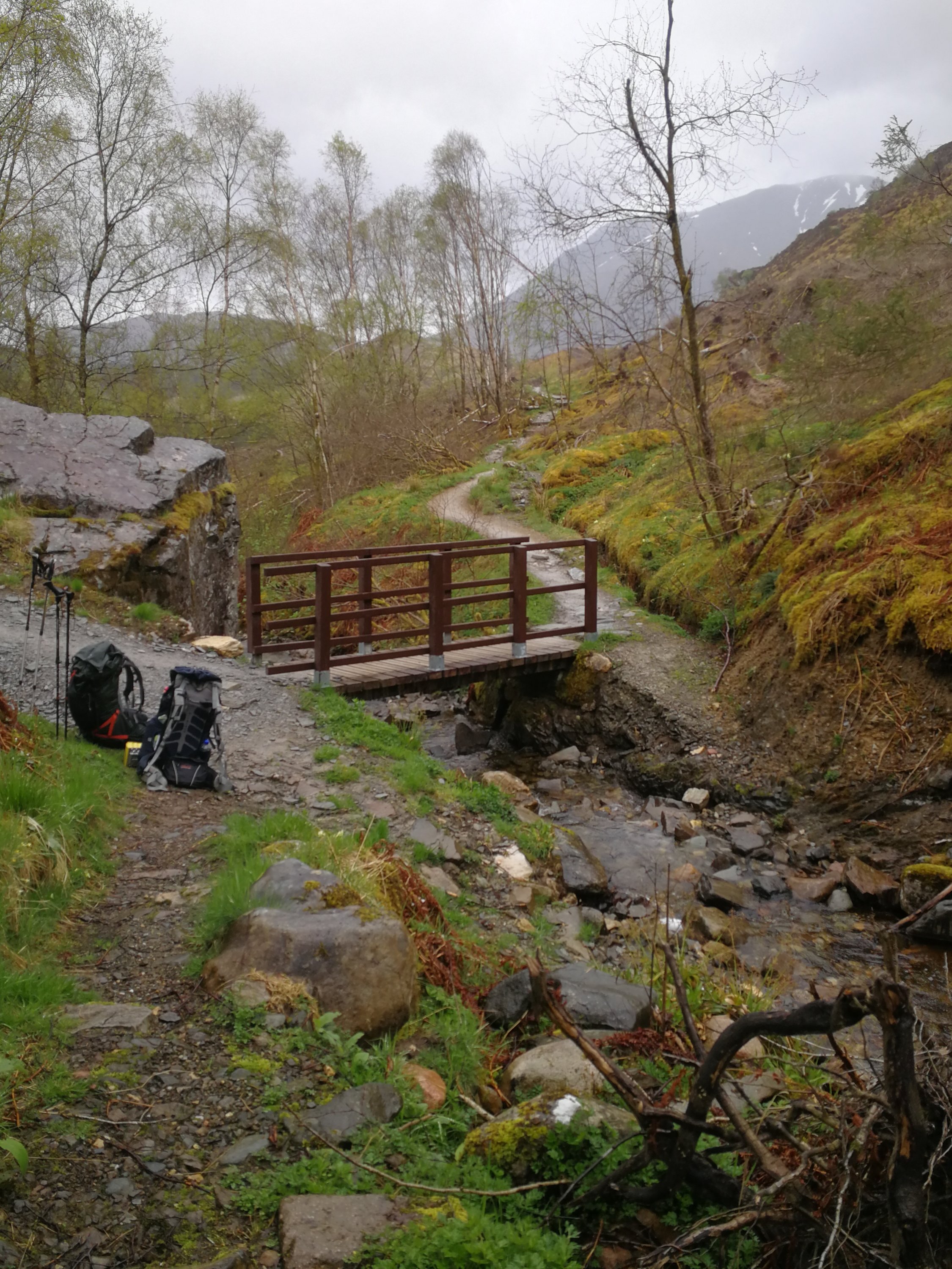 Last day! We set off through Kinlochleven dreaming of a hot meal that wasn’t either couscous or noodles. A pretty ascent then descent down into Glen Nevis, dodging the motorcross riders and being sad at the number of tress felled since we were last here.